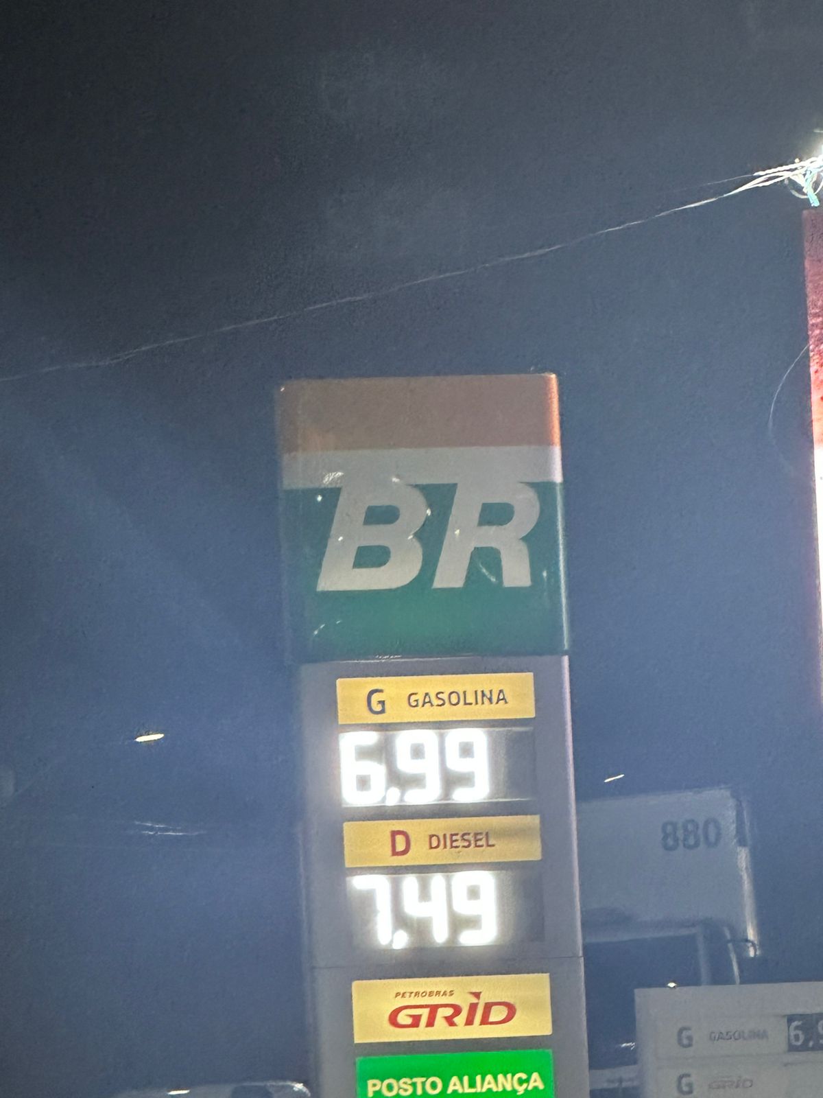 Os registros incluem estabelecimentos como Posto Aliança, Posto Leal (Rota dos Lençóis) e redes BR/Petrobras/GRID, onde os painéis eletrônicos e displays mostram gasolina comum a R$ 6,99 e diesel a R$ 7,49 em um dos casos, e ligeiras variações para cima em outro (R$ 7,08 para gasolina aditivada em um posto próximo).