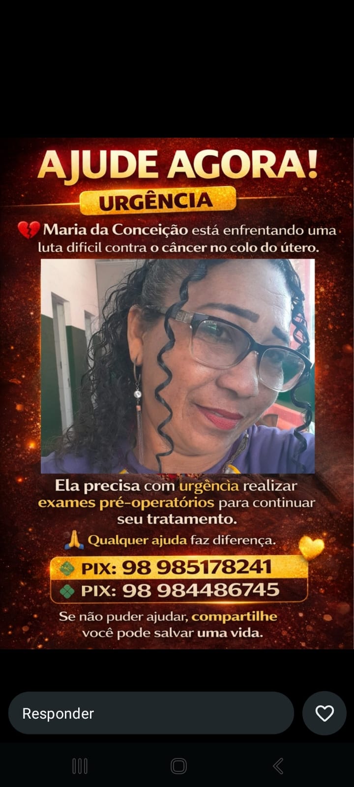 De acordo com campanhas de solidariedade que estão circulando em redes sociais e grupos de WhatsApp, Mariazinha precisa realizar os exames o mais rápido possível para prosseguir com a cirurgia e as próximas etapas do tratamento.As imagens compartilhadas mostram a mulher em momento de internação e em foto mais recente, reforçando o apelo da família e amigos por ajuda.