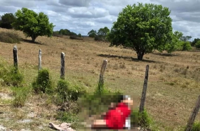 De acordo com a polícia, o corpo estava apoiado em uma cerca, em posição sentada, com as mãos amarradas e marcas de t1ros na cabeça.